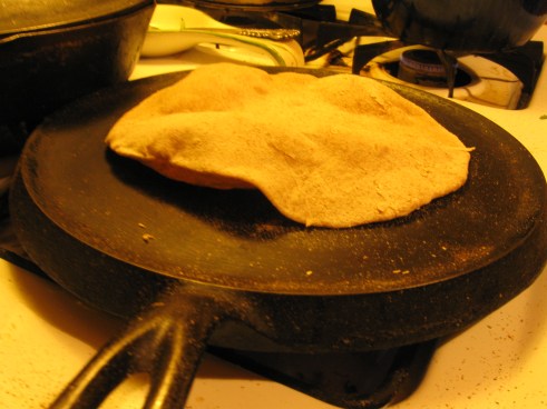 Simple. Salt, flour, water. Round ball, rolled ball. Hot skillet. Flip. Push! Done.