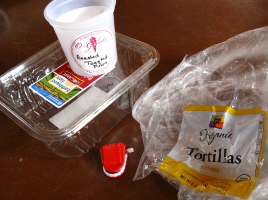 I call this little pile Friends and Family. It became apparent on around January 2nd that we wouldn’t be able to say no to gifts of plastic. Dinner guests are so happy to bring the roasted piñon gelato or the salad, and we’re so happy to have them (the guests, that is), that there’s no point letting our experiment come between us. For the record, we didn’t ask for these things. Just a little company.