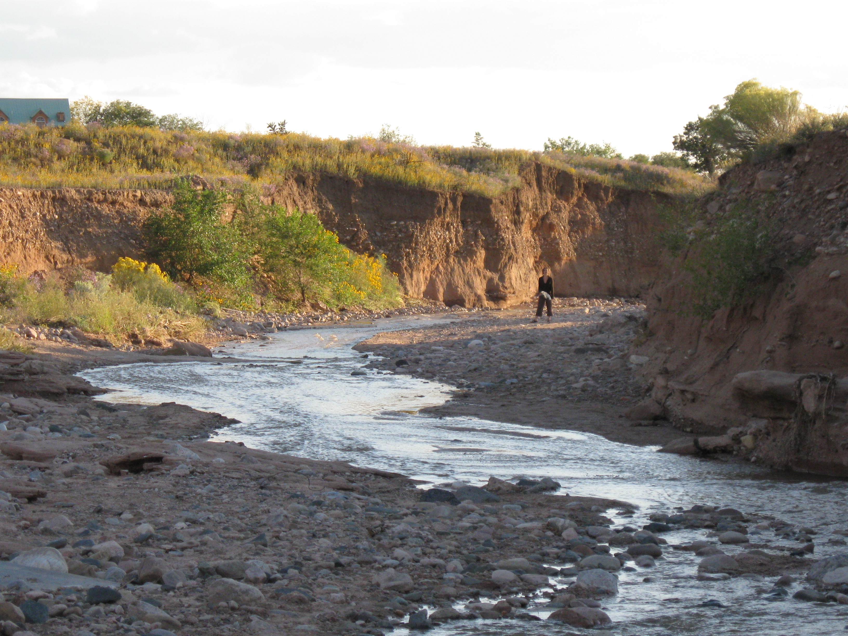 The other defining feature of my home ground is the river. Once free-flowing and healthy, today it’s dry as a bone save for what the city water managers decide to release from the reservoir that supplies this town with its drinking water. The river today is a deep, severely eroded ditch largely denuded of plant and animal life, and heartbreaking to behold. Despite this, we walk it almost daily. It doesn’t always run with water, but contains the flow of our days.
