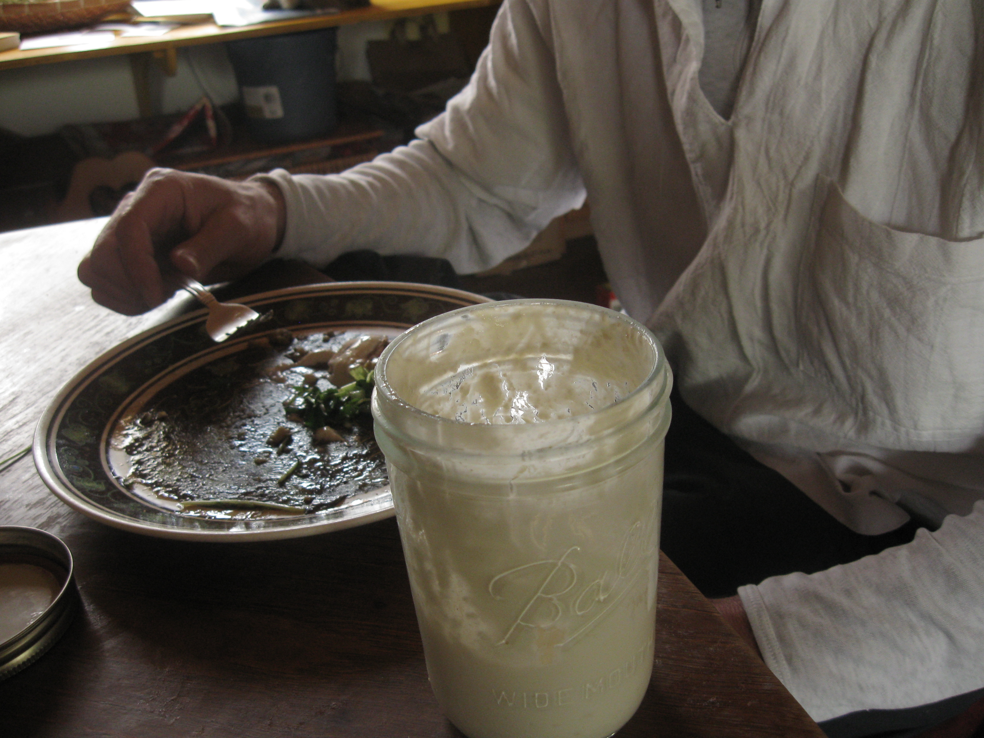 Finally I bought the cream, a whole quart of it–which amounts to a small fortune in glass bottled milk. When time came to add the culture I saw I was supposed to use light cream or half and half. Even skim milk. Skim milk! So I made pies and quiches and used up the heavy cream, bought half and half, and finally, finally, around The Man of the Place’s birthday, made the dang sour cream.