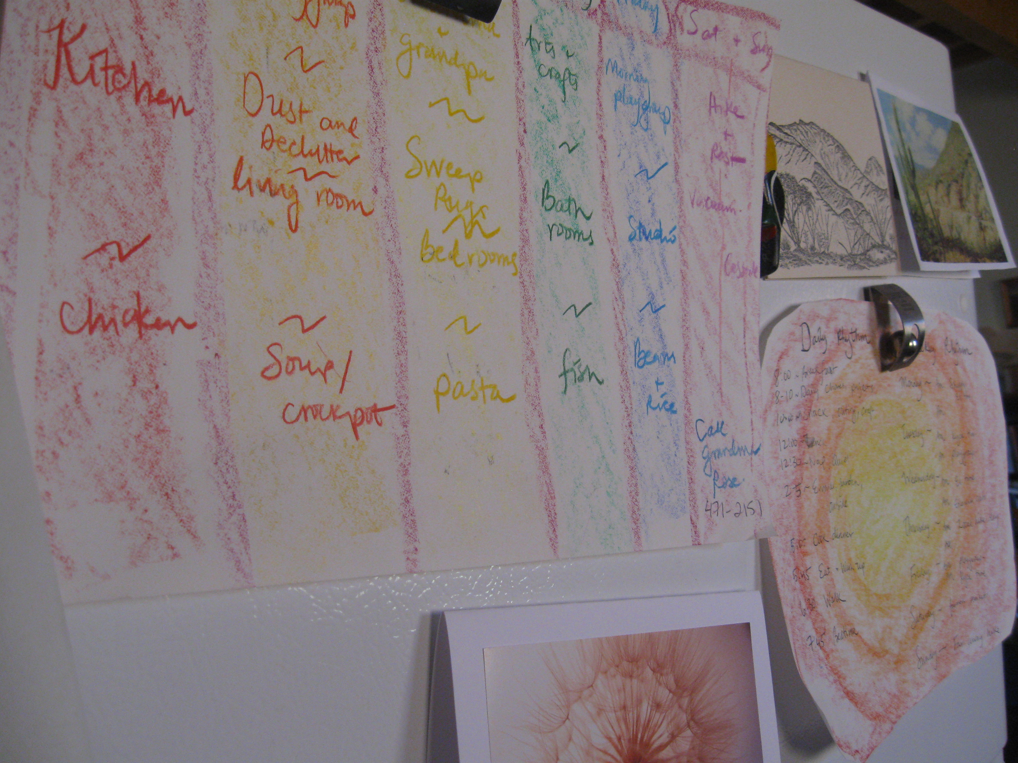 But where is the Waldorf kindergarten teacher coming to my rescue? Why, up on the fridge in a rainbow colored chart, of course.