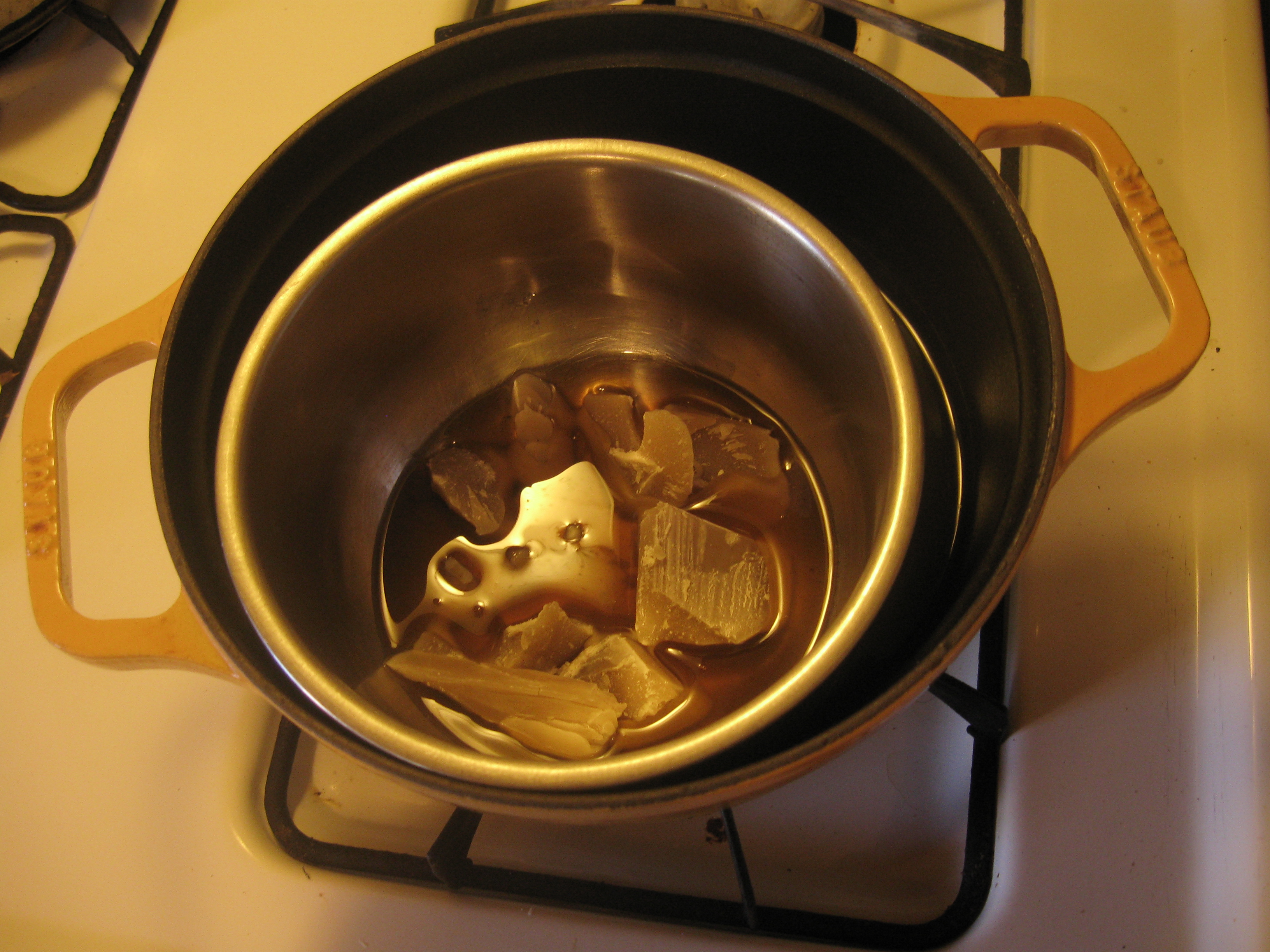 Melt in a double boiler. Remember–just a little water, and a tall-ish bowl to keep splashes out of the wax. (If your child is four or older, and very careful and meticulous, they could help with your constant supervision.)