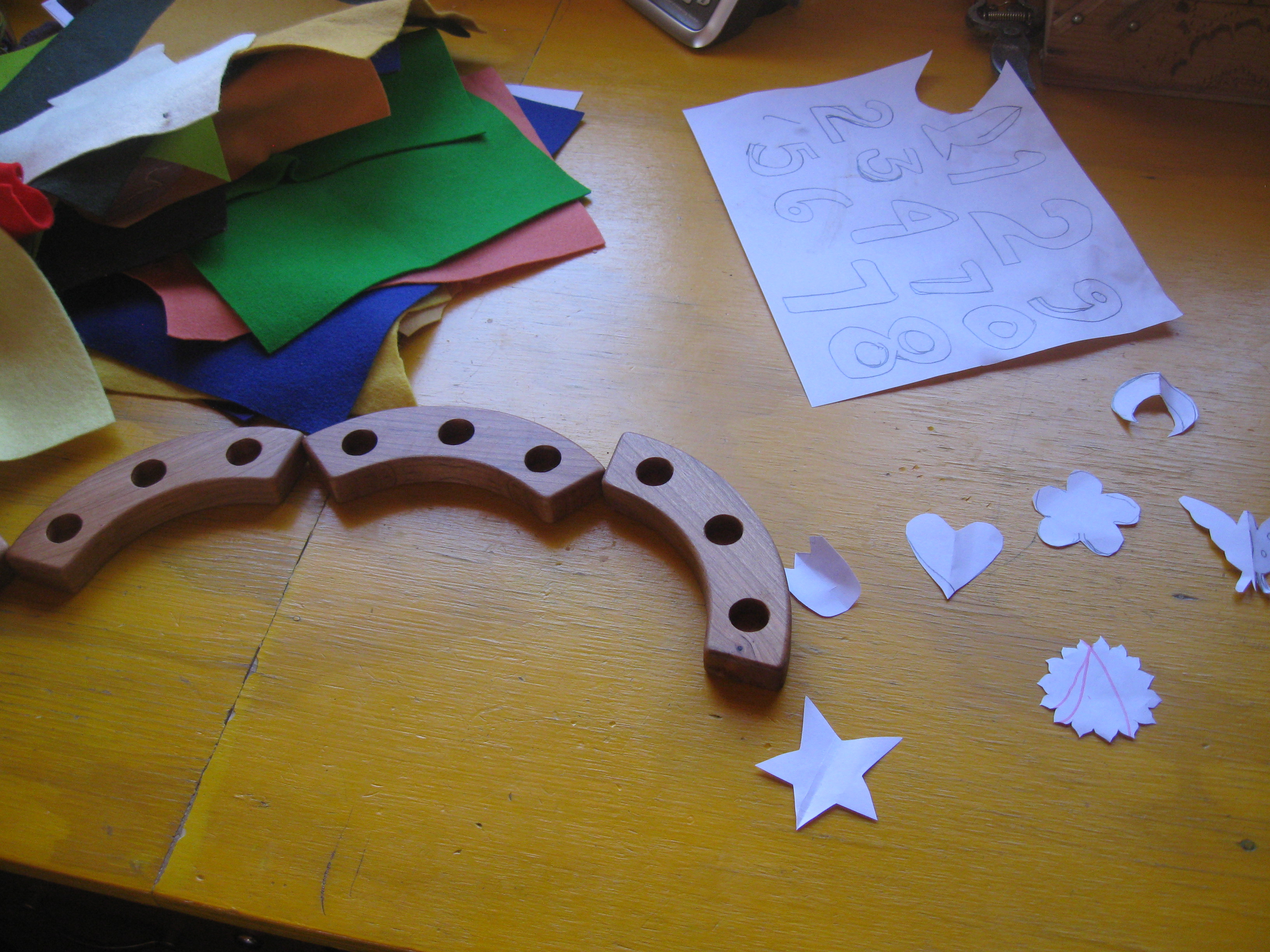 I used two layers of felt for each symbol, glued together around wire armatures threaded through the peg and bent to the shape of the felt to hold it all in place. We used regular craft glue, and left them overnight to dry.