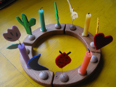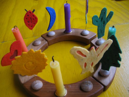 I always wanted one of these charming birthday rings for our birthday table, but the sheer number of parts–and the price tag they added up to–gave me pause. Then a dear friend gave me a spare ring. With a birthday coming, I set to work figuring out how to adorn it for, oh, about five bucks. And I thought some of you might like to hear how I did it.
