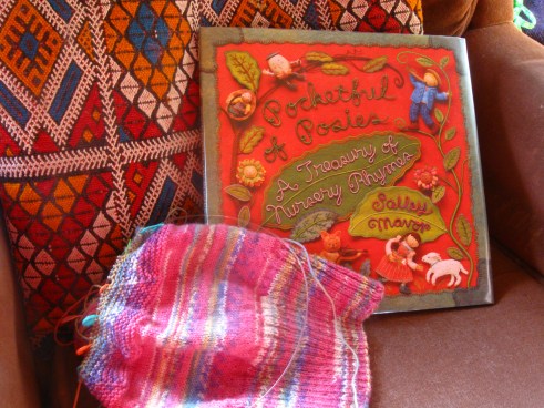 We’ve been so happy that our library got Pocketful of Posies, a book of nursery rhymes by one of our favorite’s, Salley Mavor. It is such a feast for the eyes! (I loved the illustrations in another book she did, In the Heart, so much that it inspired a whole “line” of repurposed and embroidered woolen clothes like the ones in the book.) The link on her name takes you to all her books.